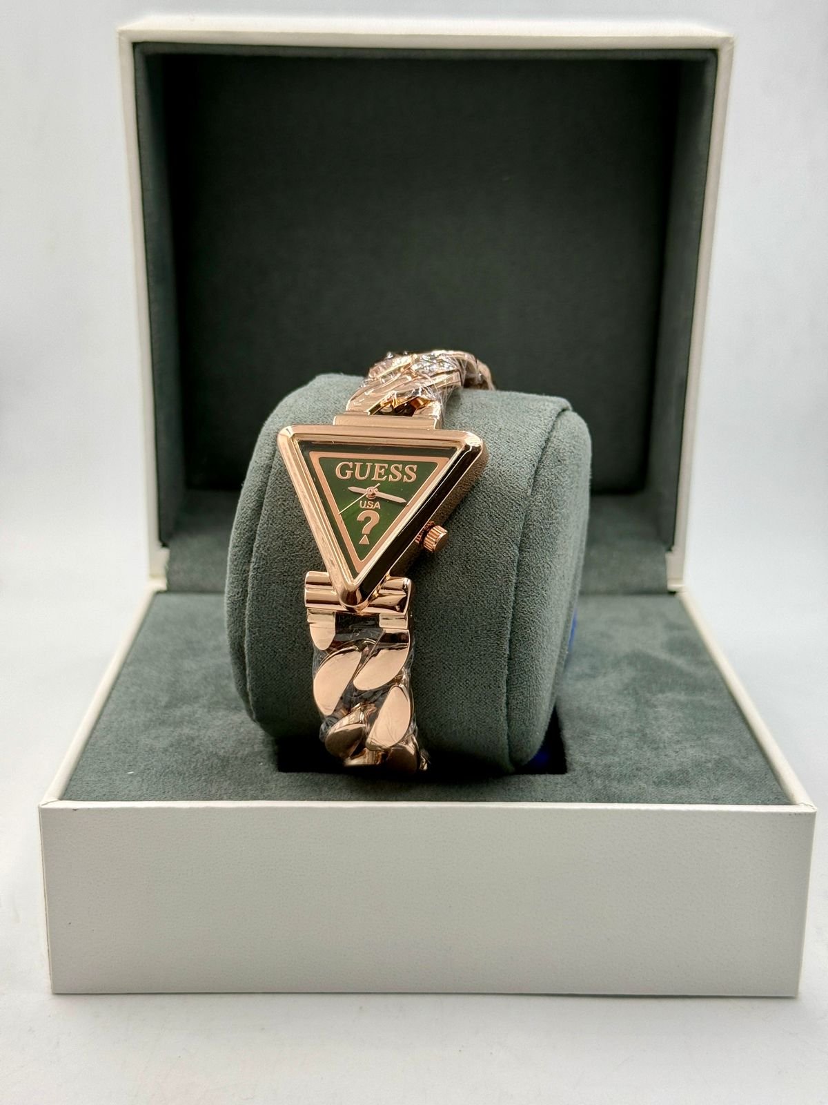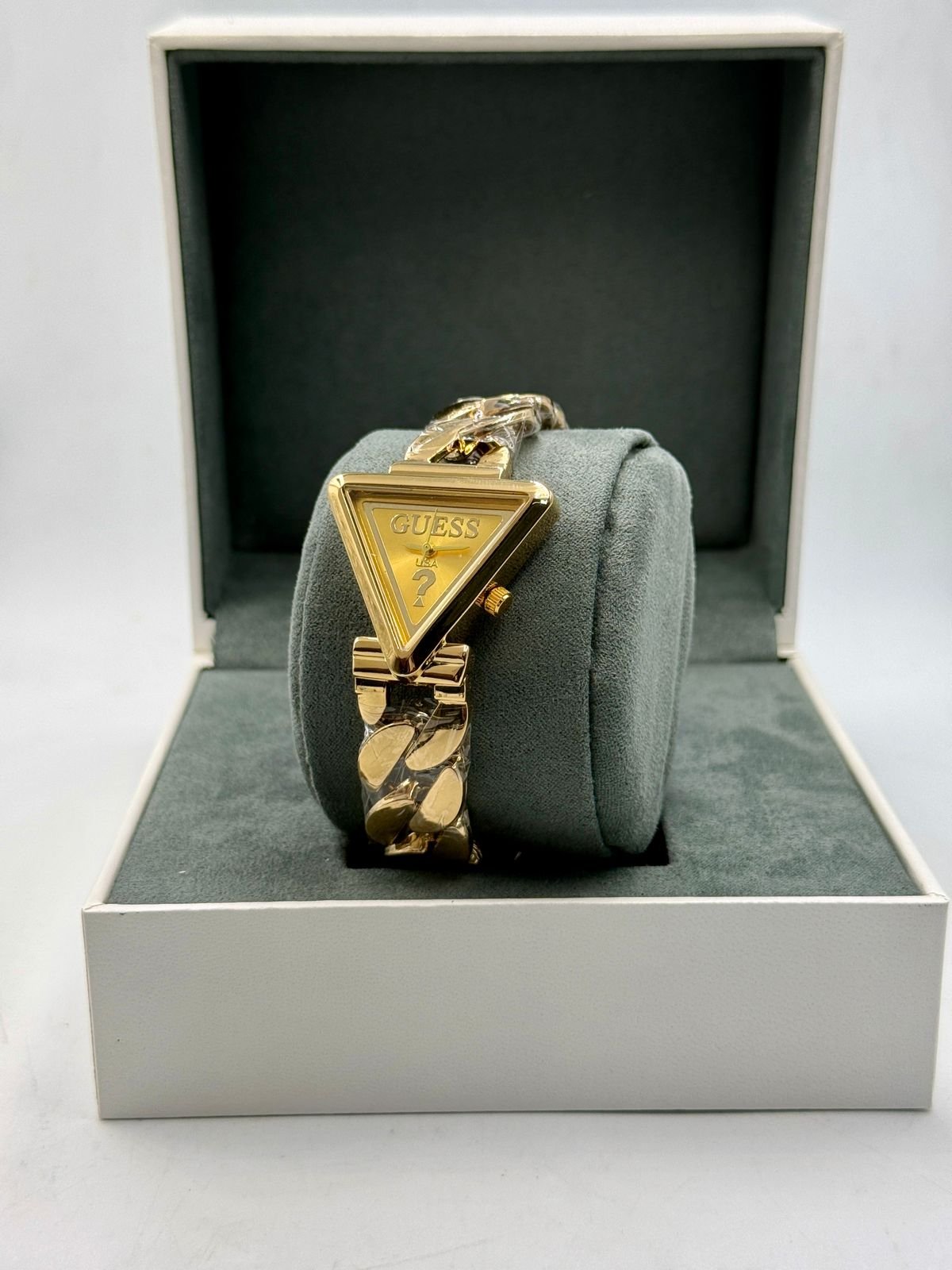 Embrace the spotlight with the GUESS Fame Triangle Dial Watch, a timepiece designed for those who command attention. This stunning watch features a bold and geometric triangle-link bracelet that makes a powerful style statement, seamlessly blending luxury with contemporary edge.