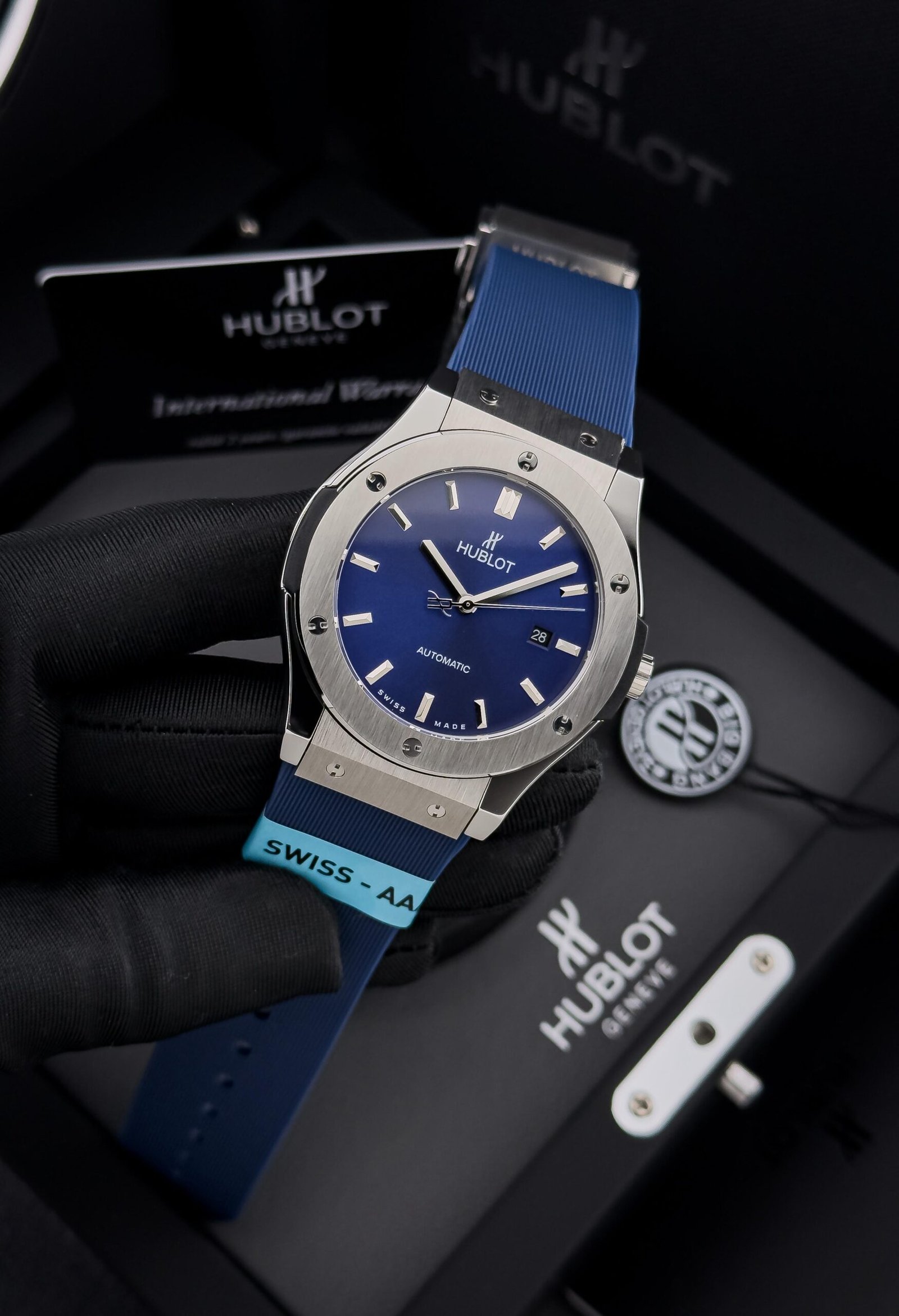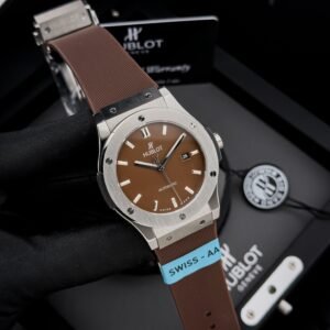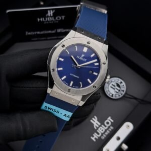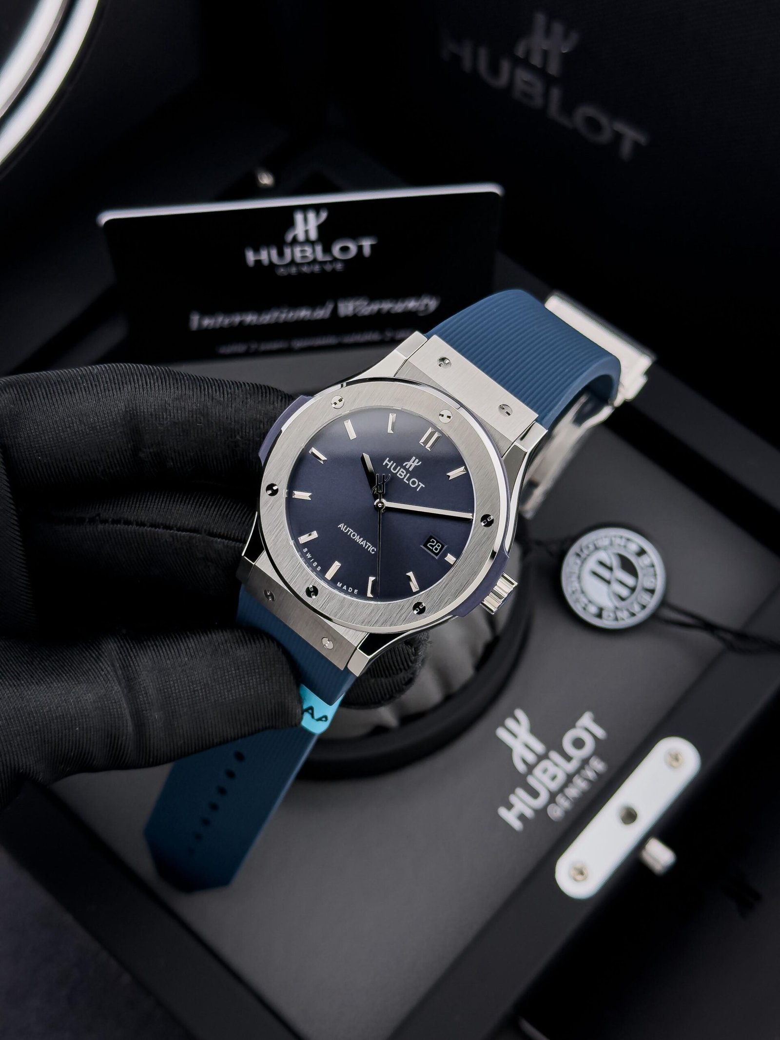 Powered by a precise self-winding mechanical movement, visible through the sapphire case back, this watch is a testament to HUBLOT’s commitment to technical excellence. Paired with a comfortable black rubber strap, seamlessly integrated with the titanium deployant buckle, the Classic Fusion delivers a perfect fusion of sporty dynamism and refined luxury. It is not just a watch; it is a statement of sophisticated taste for the modern connoisseur.