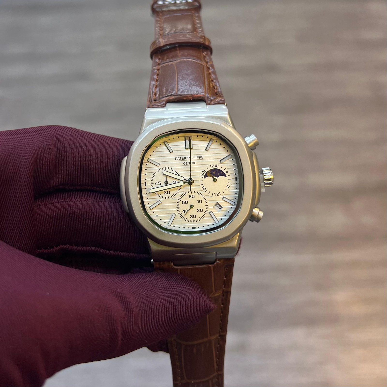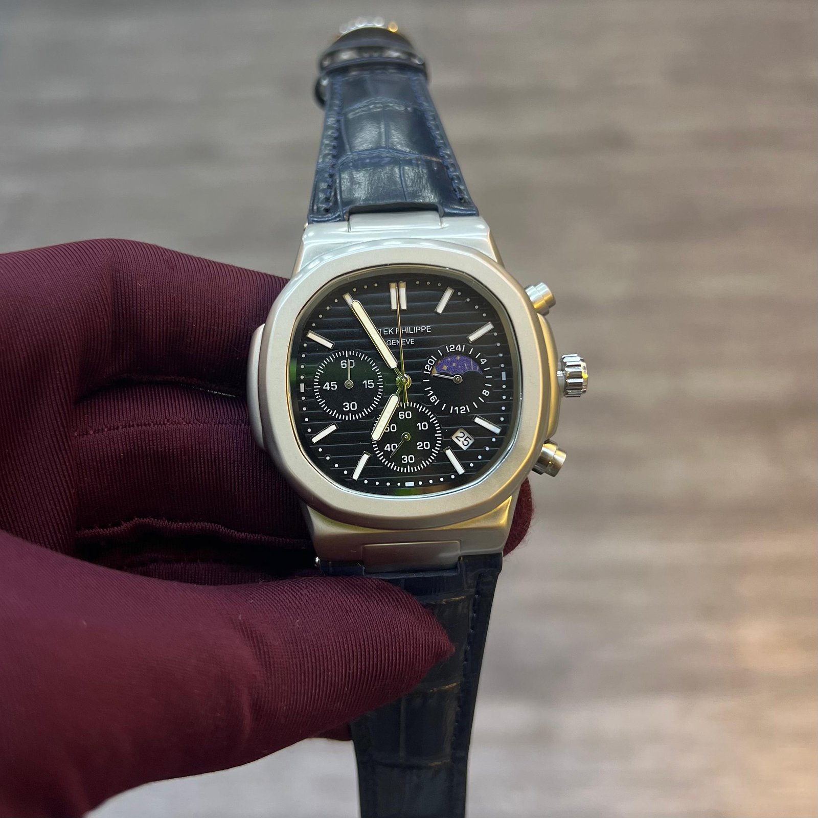 Presenting the Patek Philippe Chronograph, an emblem of horological supremacy where centuries of Swiss mastery converge with visionary innovation. This timepiece is more than an instrument of time; it is a legacy on the wrist. Housed in an exquisite case crafted from noble 18k gold or platinum, every polished facet captures and plays with light. The intricate dial, a masterpiece of clarity and depth, features precisely aligned chronograph sub-dials, applied Breguet numerals, and a flawless finish that rewards the discerning eye. Powered by a meticulously hand-finished, self-winding mechanical chronograph movement visible through the sapphire crystal case back, it represents the pinnacle of accuracy and craftsmanship. Each component, from the pushers to the alligator leather strap with its prestigious fold-over clasp, is executed to super-luxe perfection. For the collector who demands the absolute finest, this chronograph is not merely purchased—it is entrusted to the next generation.