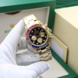 The ROLEX Daytona Rainbow features a breathtaking gem-set bezel with rainbow sapphires, a diamond dial, and premium 18k gold case. A legendary chronograph for the discerning collector.