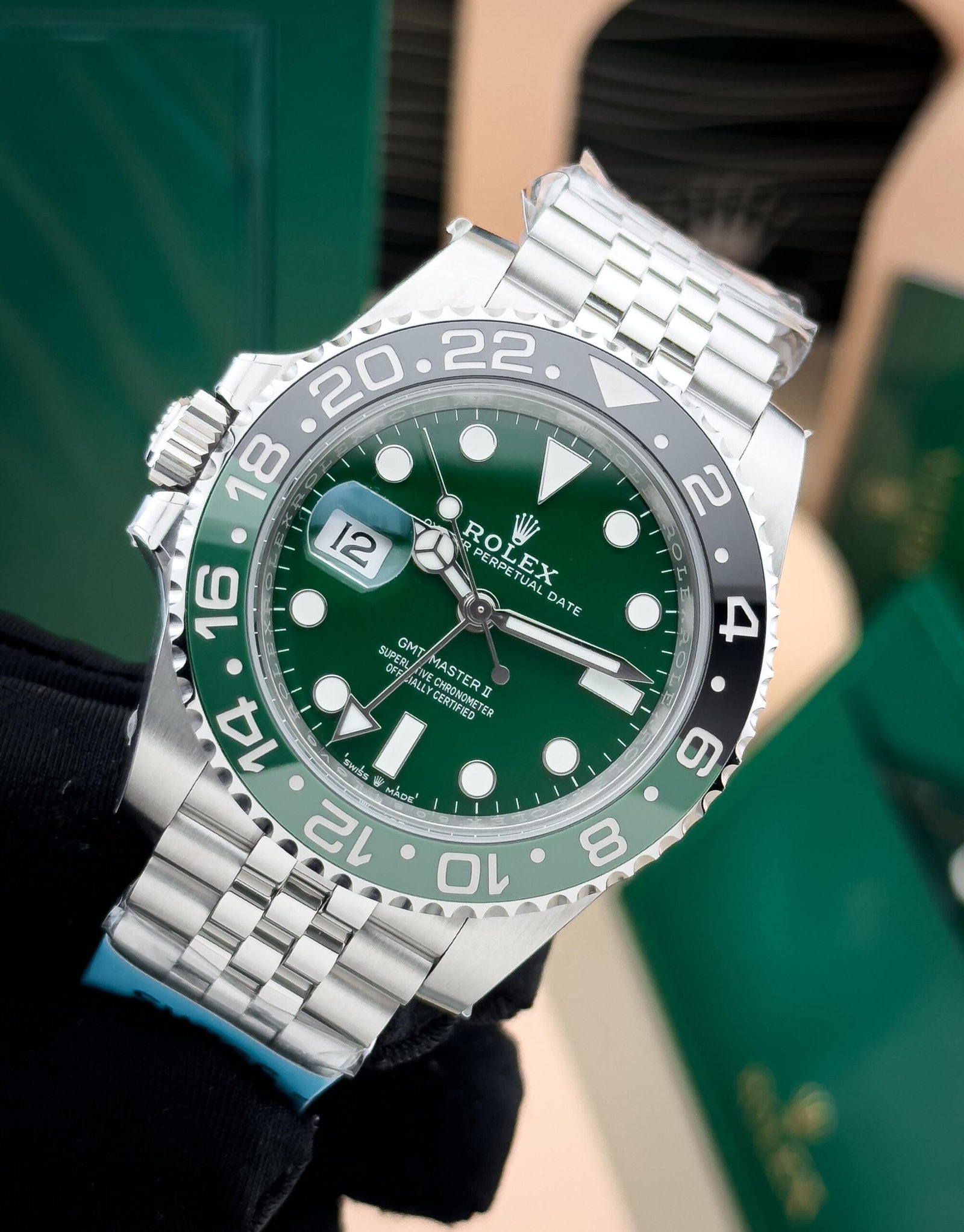 The Rolex GMT-Master II Sprite in super master quality features a left-handed design with a striking green 24-hour hand and green/black Cerachrom ceramic bezel. Built with precision, it offers dual time-zone functionality, a robust Oyster case, and an Oysterlock bracelet, delivering exceptional craftsmanship and style.