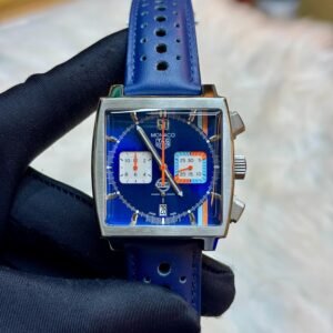 The TAG Heuer Monaco Automatic Chronograph stands as a definitive icon of bold design and technical precision. Instantly recognizable by its distinctive square case, born from a revolutionary waterproof construction, this watch is a tribute to a legacy of motorsport audacity. Housed within its refined stainless steel chassis is the sophisticated Calibre Heuer 02, a Swiss-made automatic movement boasting an impressive 80-hour power reserve. The iconic blue dial, adorned with sunray-brushed finishing, features contrasting white chronograph sub-dials, vibrant red accents, and a faceted sapphire crystal that offers exceptional clarity and scratch resistance. Paired with a perforated calfskin leather racing strap, every detail is engineered for performance and style. This is more than a timepiece; it is a statement of rebellion, innovation, and master craftsmanship for those who dare to be different.